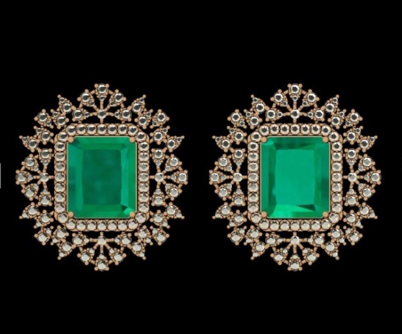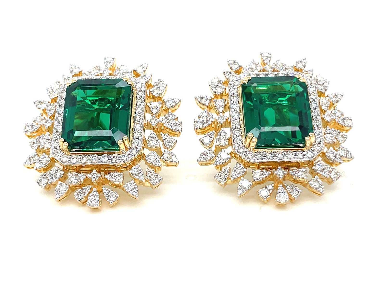 Make a bold entrance with these statement stud earrings, crafted in solid 14K gold and designed for weddings, festive events, and glamorous parties. Each earring features a striking 16.78 CT green hydro emerald at the center, framed by 2.60 carats of sparkling natural diamonds (GH VVS) for radiant brilliance.
