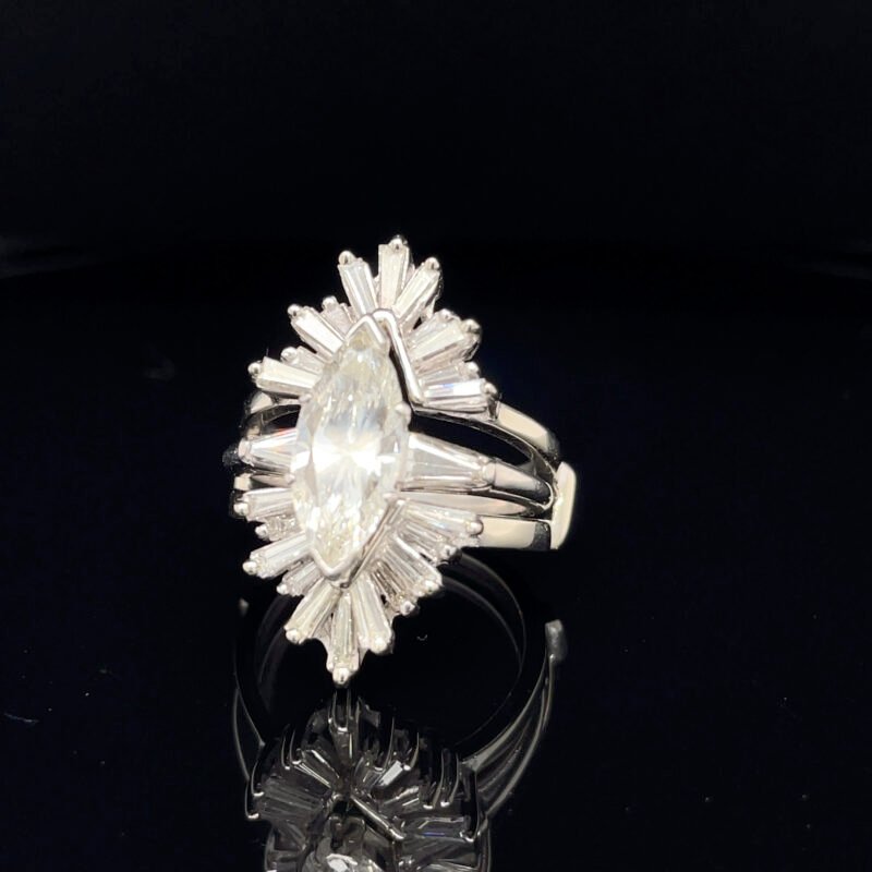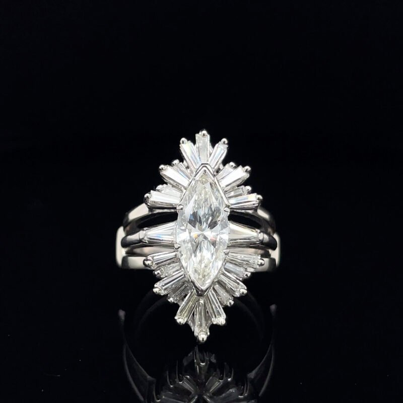 The centerpiece features a dazzling 2.20 carat marquise-cut diamond, complemented by a sider ring adorned with 1.20 carats of baguette diamonds—together creating a stunning display of sparkle and sophistication.