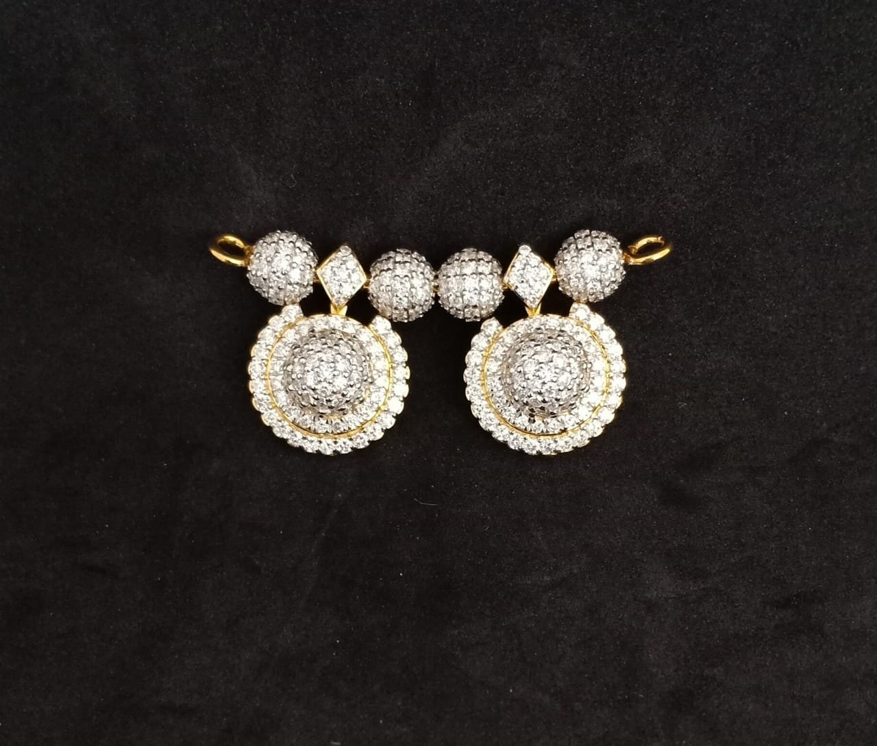 The centerpiece features a delicate diamond-studded motif, nestled between iconic round gold balls (mani) — each a symbol of prosperity, wholeness, and auspiciousness in Maharashtrian culture. The dual black-bead strands, synonymous with marital strength and protection, hold the design together with grace.