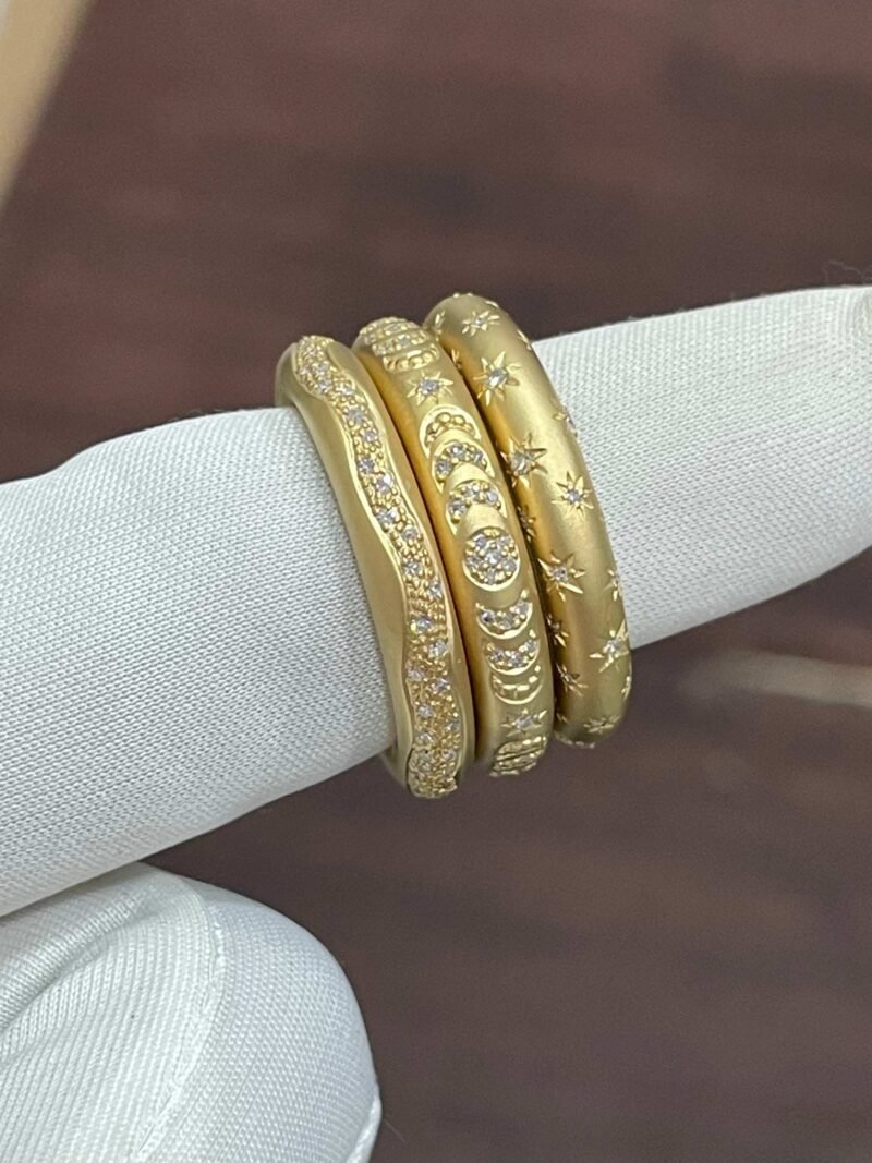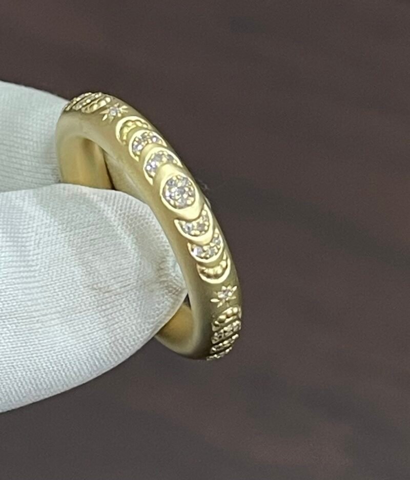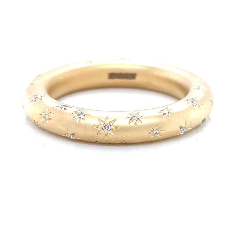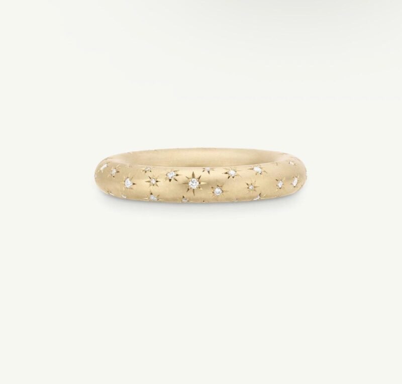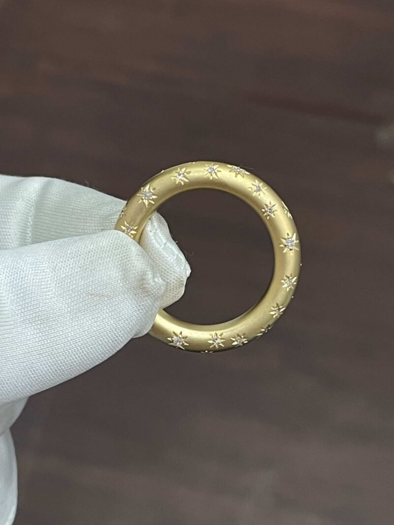 The Among The Stars Ring is a handcrafted 18Kt yellow gold diamond band, scattered with hand-set brilliant cut diamonds that shimmer like a starlit sky. Designed with celestial inspiration, this ring is a timeless symbol of enduring love, guidance, and inner light.