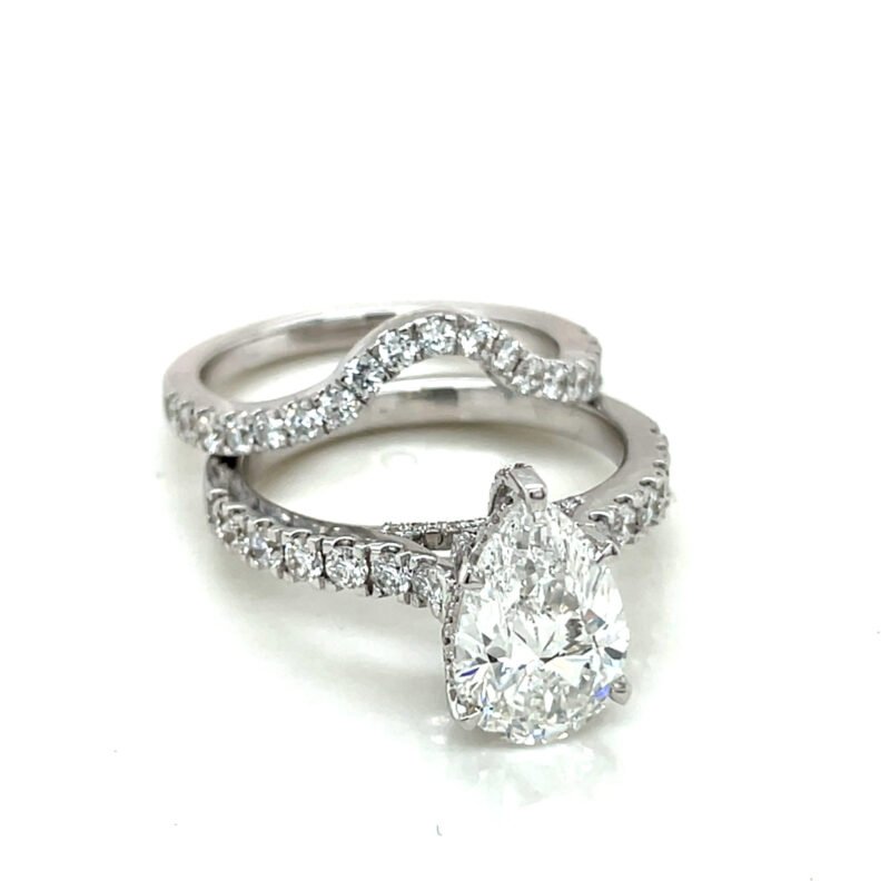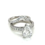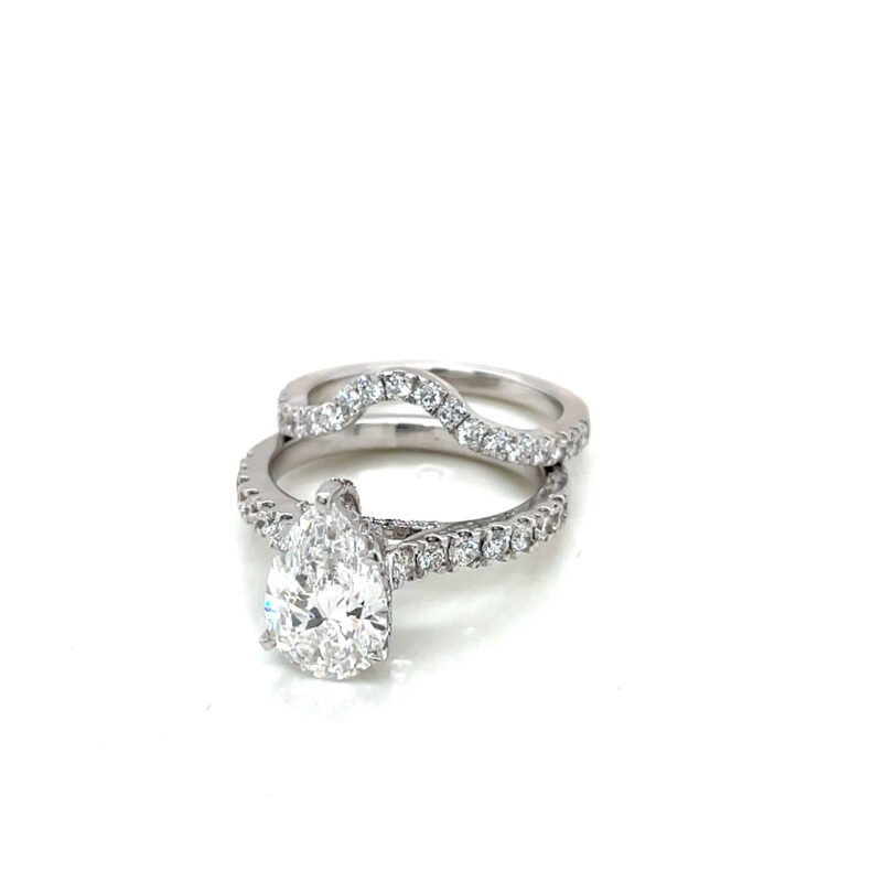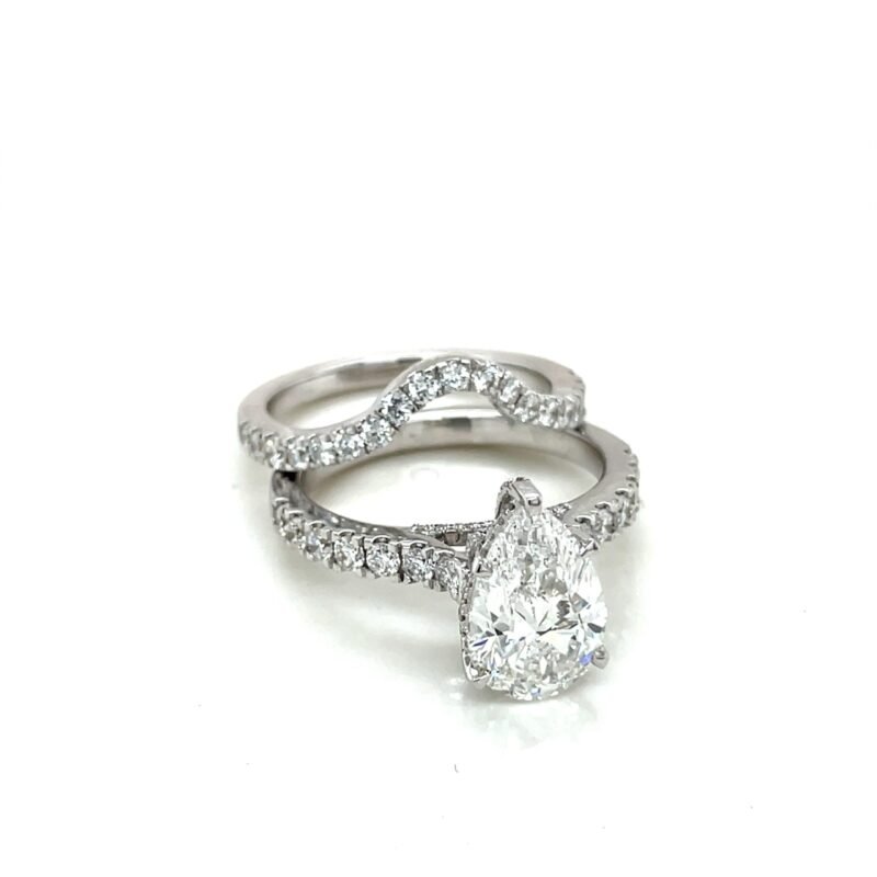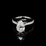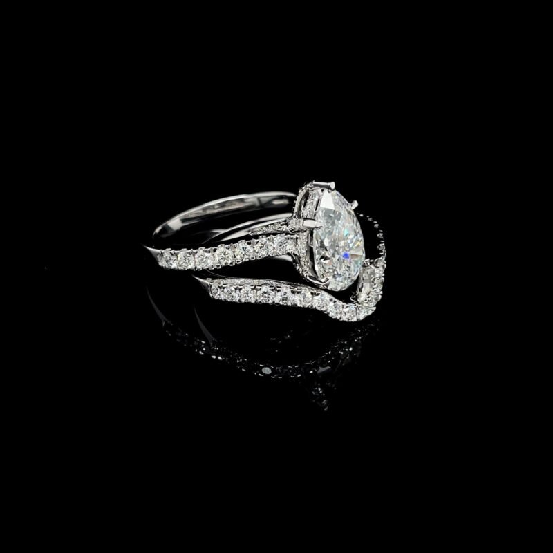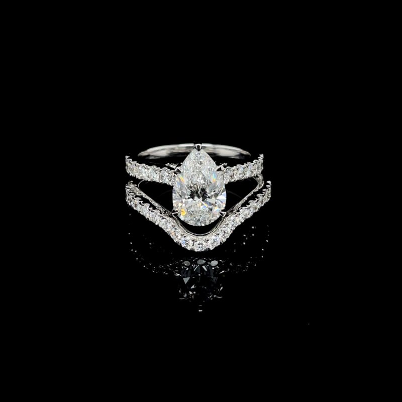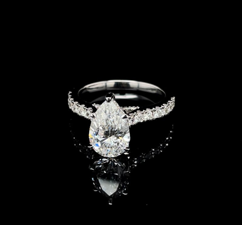 Celebrate your love with a stunning, ethical, and timeless piece. This handmade pear-shaped lab grown diamond ring features a brilliant 3.06 CT center stone, surrounded by 1.35 CT round-cut side diamonds, all set in your choice of 14K gold.