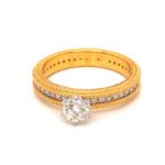 This elegant diamond ring, designed for the modern bride or a heartfelt proposal, features a 0.44 ct natural center diamond accented by 0.32 ct side diamonds, all handset in luxurious 14K solid gold.