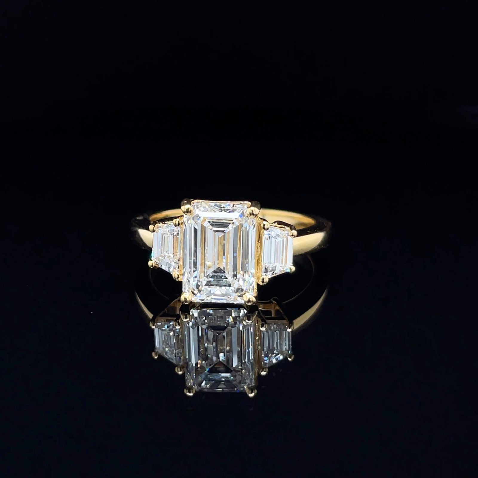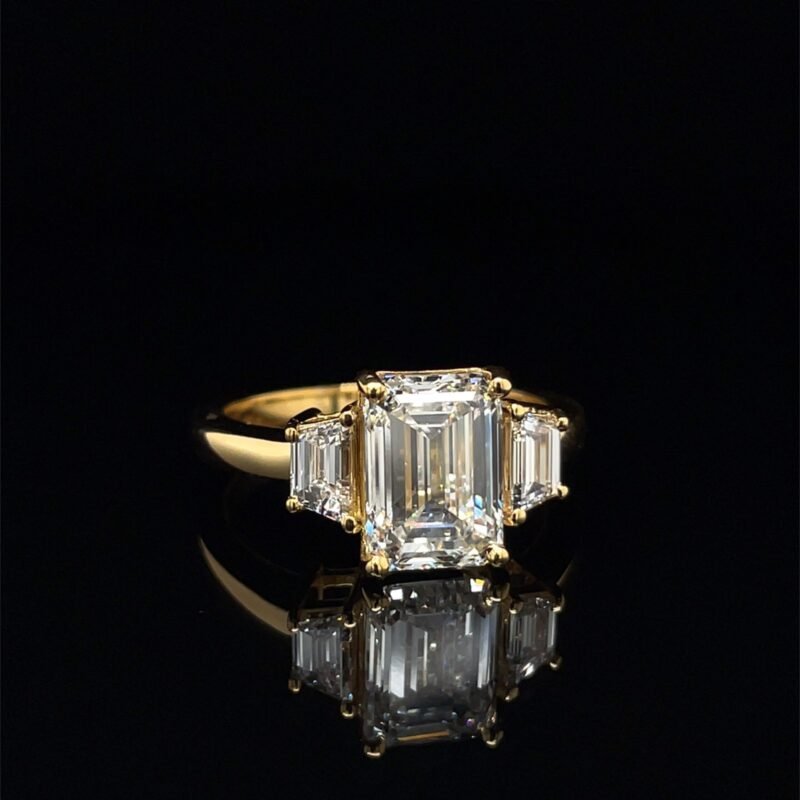 This stunning design features a? emerald cut? center diamond flanked by elegant trapezoid side stones, creating a sophisticated and balanced silhouette. It sparkles with clarity and is set in a sleek 14KT yellow gold band.