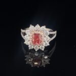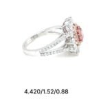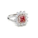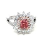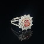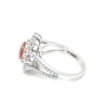 Make a lasting impression with this stunning pink diamond ring, crafted to symbolize love, elegance, and timeless beauty. At its heart lies a vivid 0.88 carat cushion-cut lab-grown pink diamond, radiating vibrant color and charm. The center stone is surrounded by two dazzling rows of round-cut EF/VVS lab-grown white diamonds (totaling 1.52 carats), offering exceptional brilliance and fire.