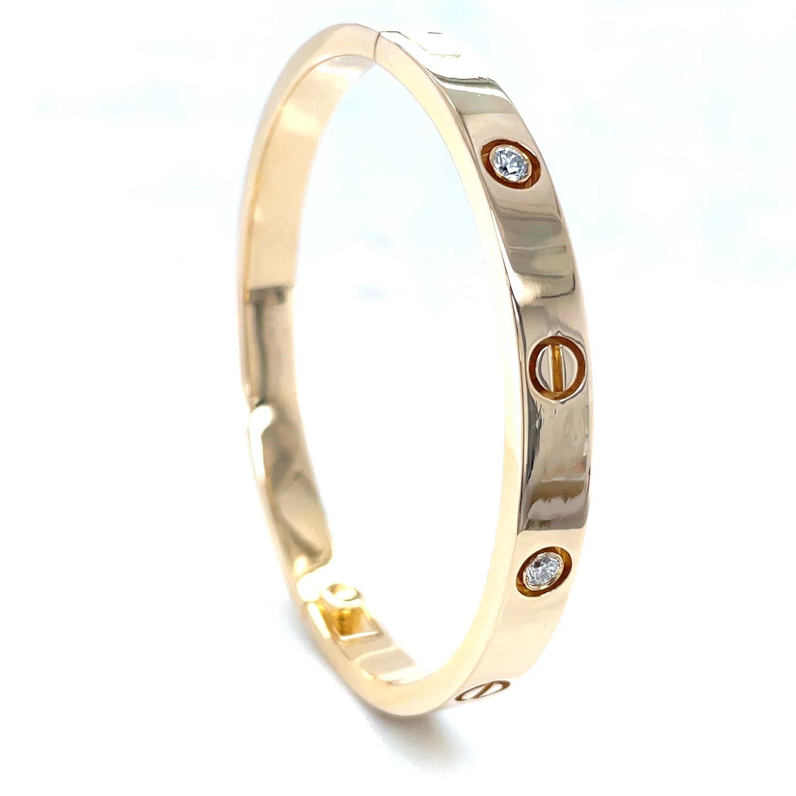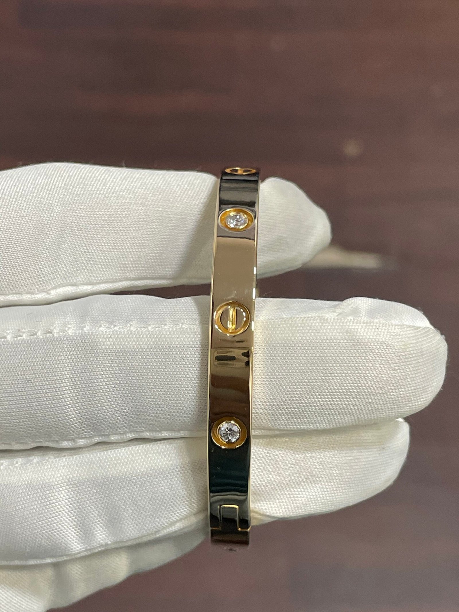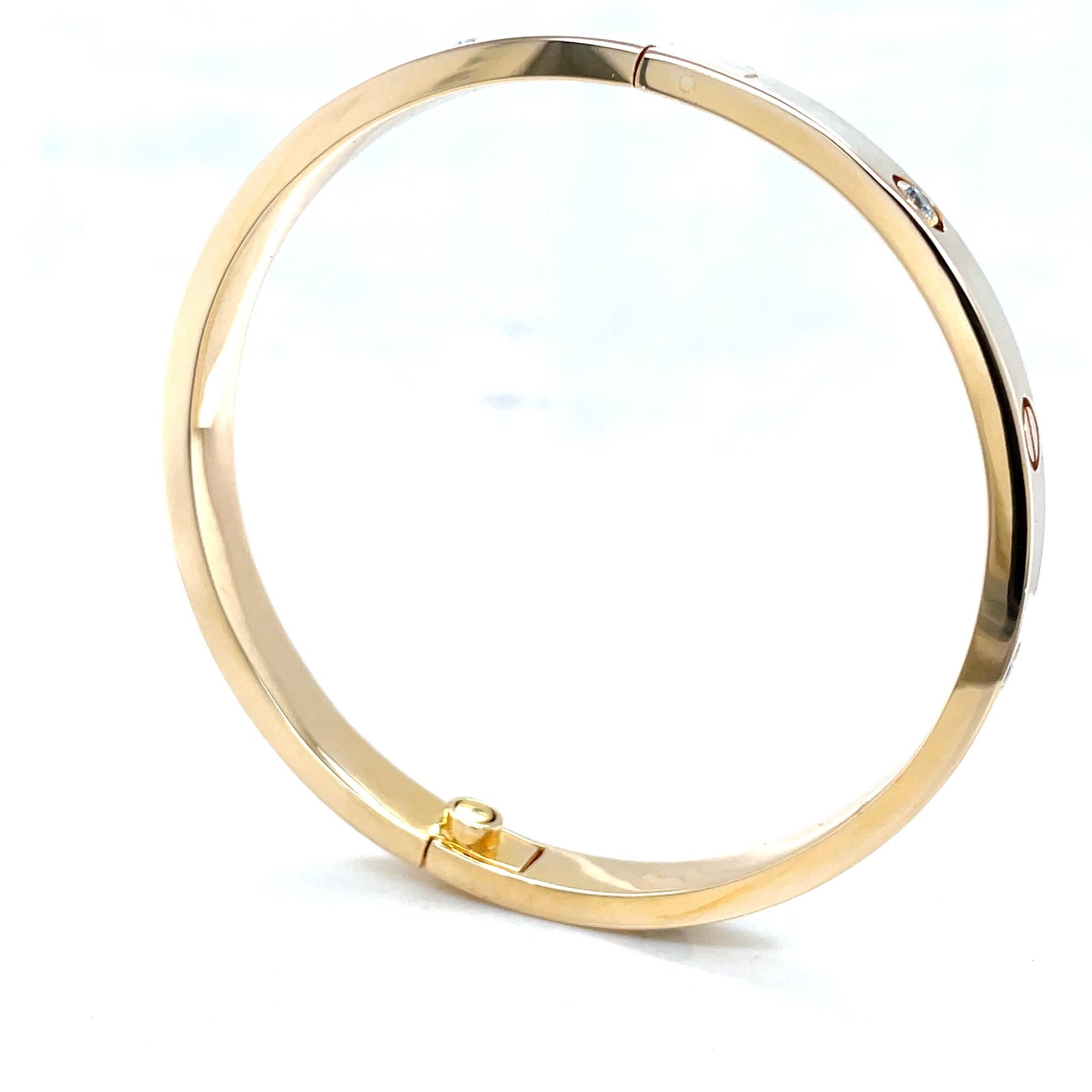 A timeless symbol of commitment and luxury — this Cartier-style love bracelet is crafted in solid 18K yellow gold and features 4 brilliant EF-VS quality diamonds set elegantly across the band. Designed with an openable hinge on one side and a secure screw mechanism on the other, this bracelet combines craftsmanship, comfort, and sophistication.