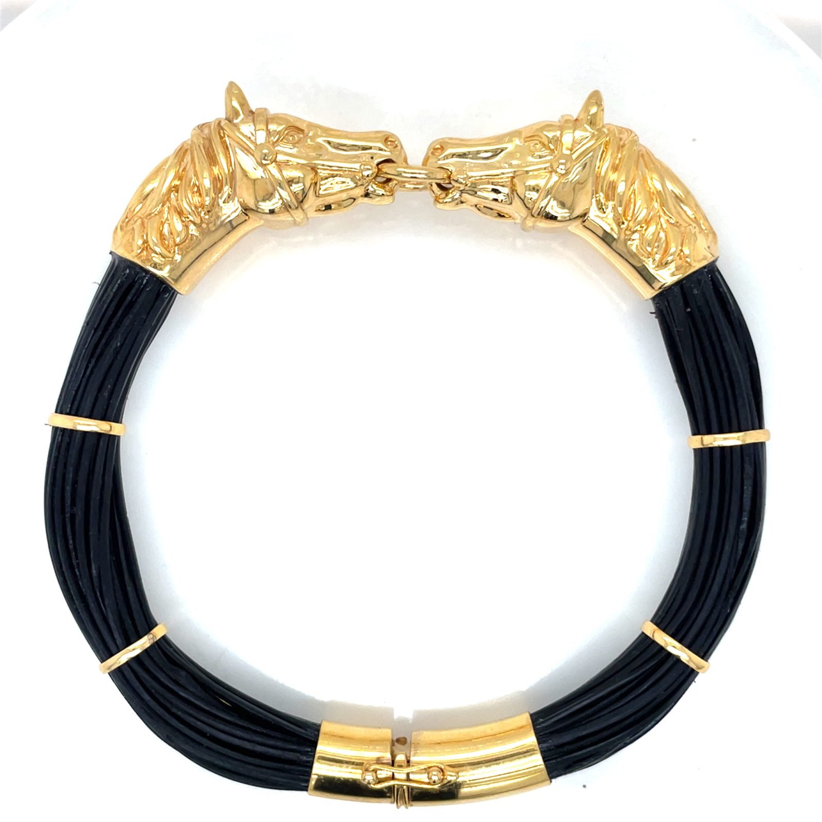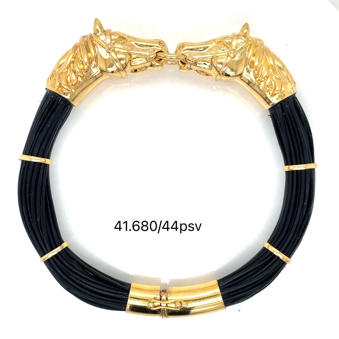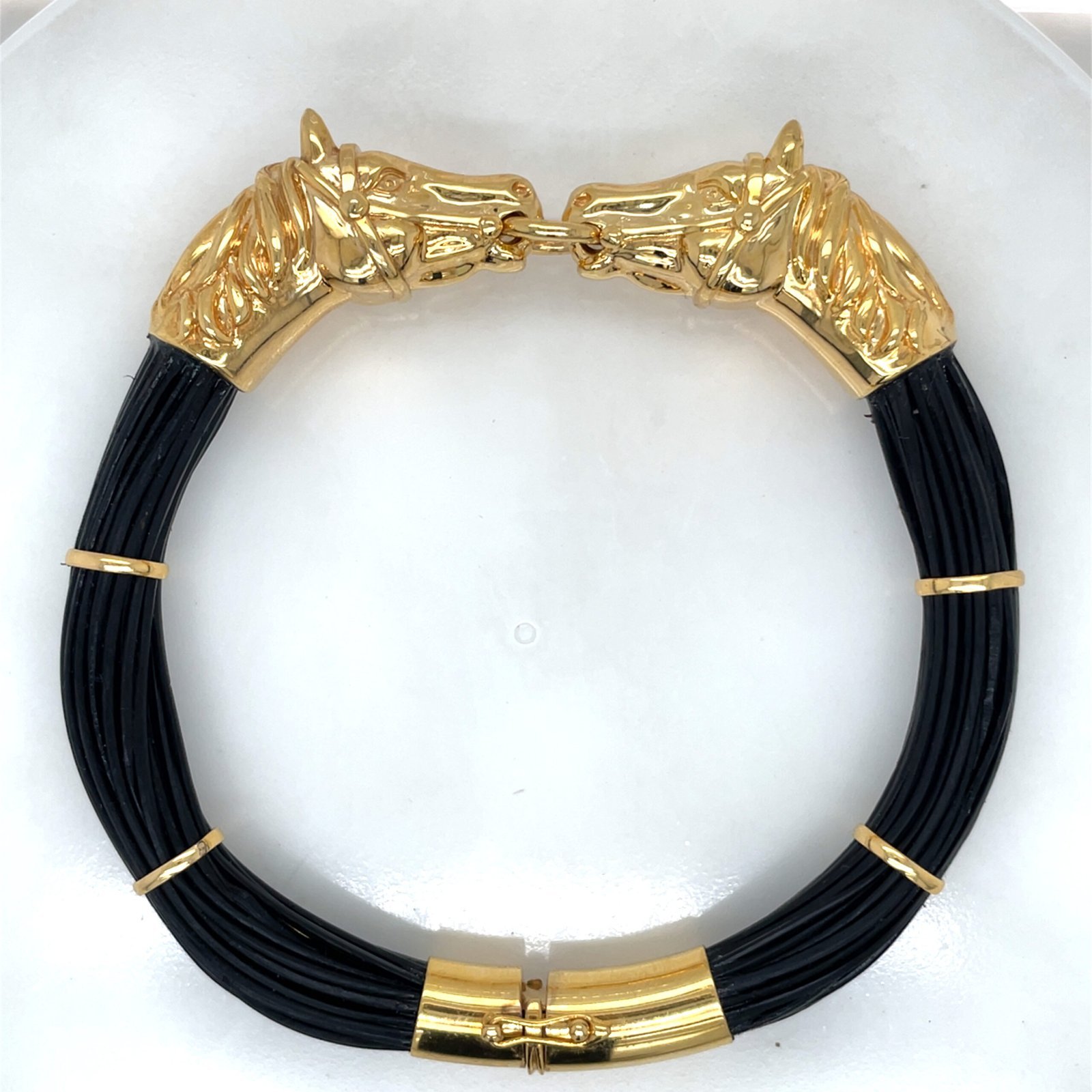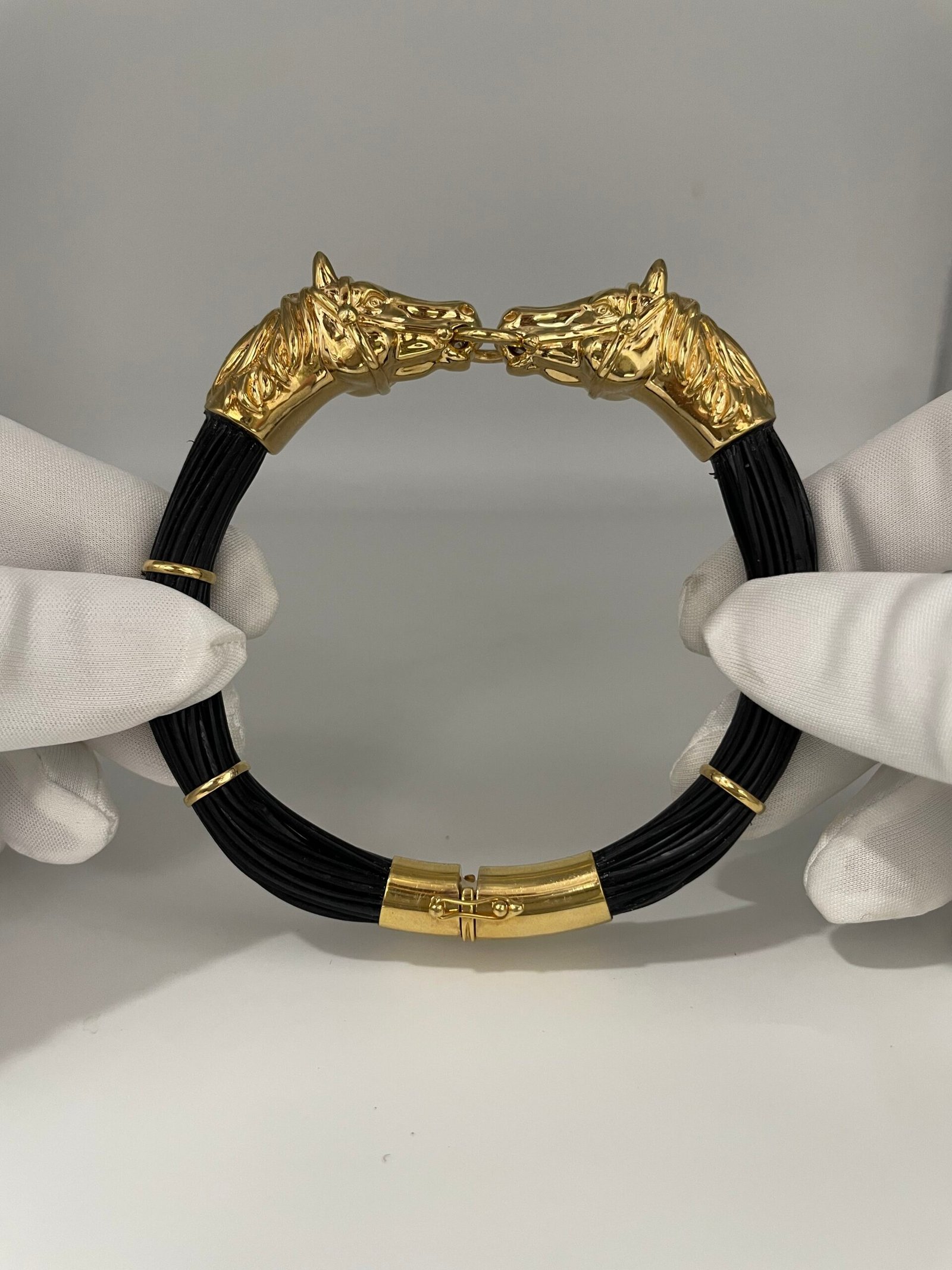The bracelet features a detailed 3D horse motif, symbolizing strength and power, and is designed with an openable clasp for ease of wear. The 44 strands of black wire , intricately bound with gold, are considered auspicious and bring wealth and good luck according to Indian tradition.