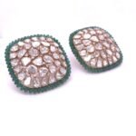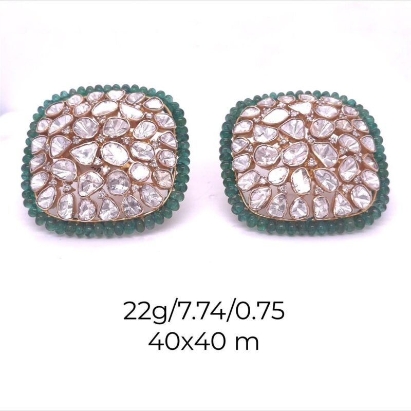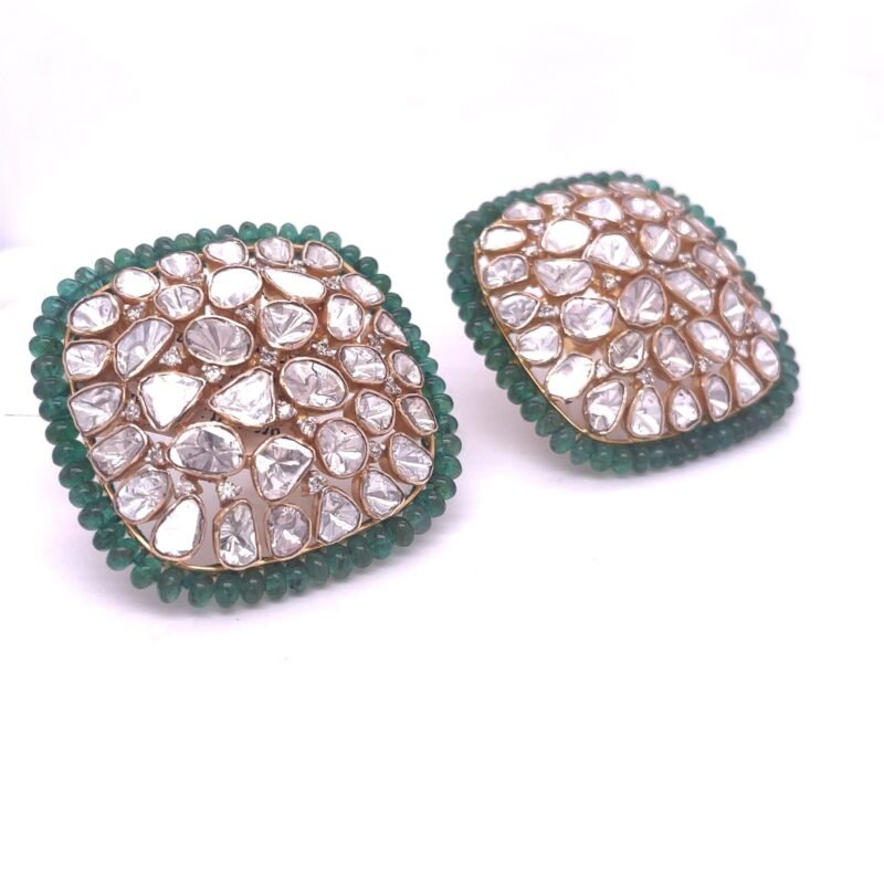 Exude timeless elegance with these handcrafted Polki and Emerald Bead Earrings, a perfect blend of traditional charm and modern craftsmanship. Designed in 14K Yellow and White Gold, these 40MM x 40MM earrings are adorned with shimmering lab-created diamonds, vintage-style uncut Polki, and rich emerald beads for a royal look.
