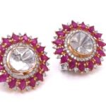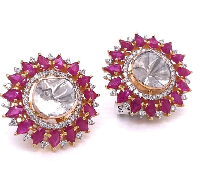 A luxurious blend of heritage and elegance, these handcrafted 27MM earrings feature vivid 6.76 ct natural rubies, sparkling 1.18 ct round lab diamonds, and vintage-inspired 1.58 ct uncut Polki diamonds � all beautifully set in 14K Yellow & White Gold.