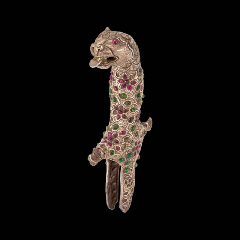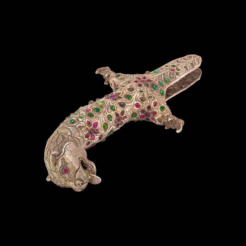 This exquisite silver dagger is a rare heirloom from the royal courts of the Avadh Dynasty, echoing the grandeur of mid-19th century Mughal India. Entirely handcrafted, the piece is adorned with fine metallistic detailing and features an intricately engraved lion face motif—a powerful symbol of strength and nobility in royal iconography.