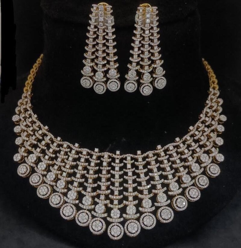 This stunning traditional diamond necklace & earrings, handcrafted in 14K yellow gold, is a timeless masterpiece designed for brides who seek elegance and brilliance on their wedding day. Featuring a 19.39 ct natural diamond weight, the necklace is meticulously micro-set to ensure maximum sparkle and precision. For those seeking an alternative, we also offer a lab-grown diamond option, maintaining the same level of craftsmanship and beauty.
