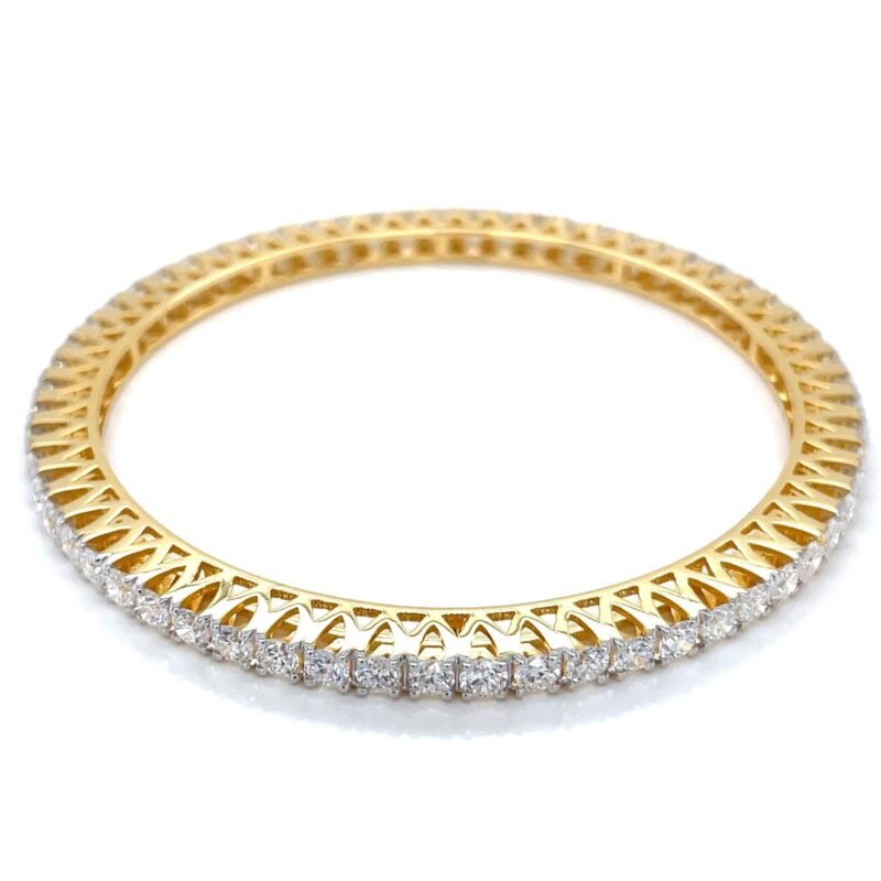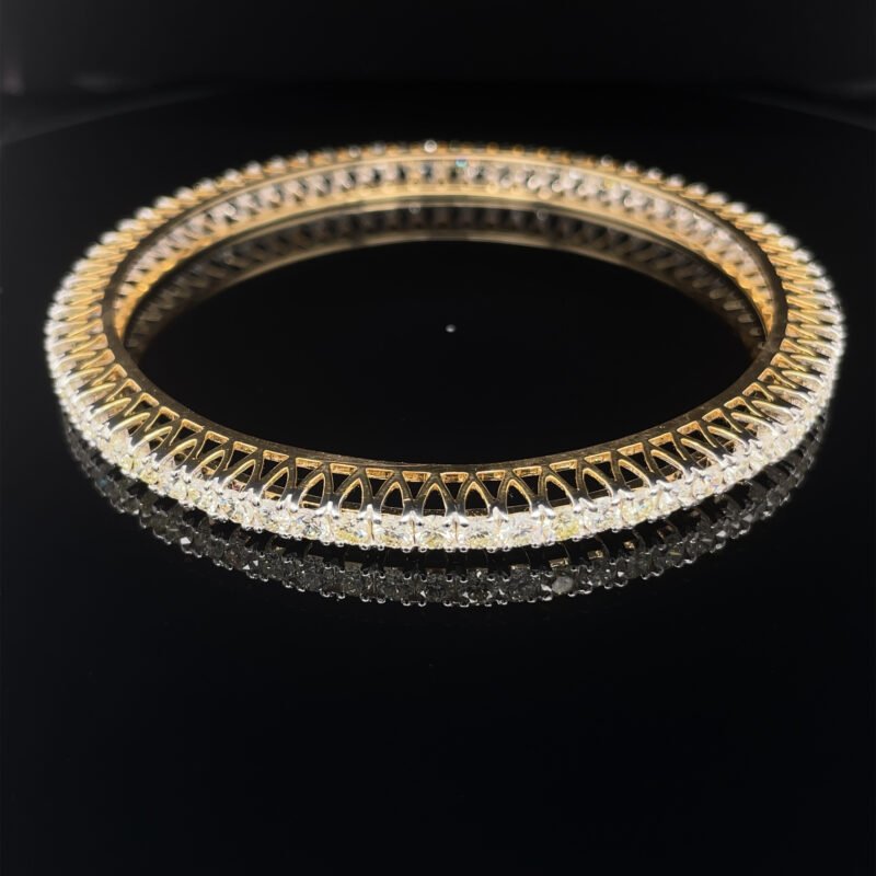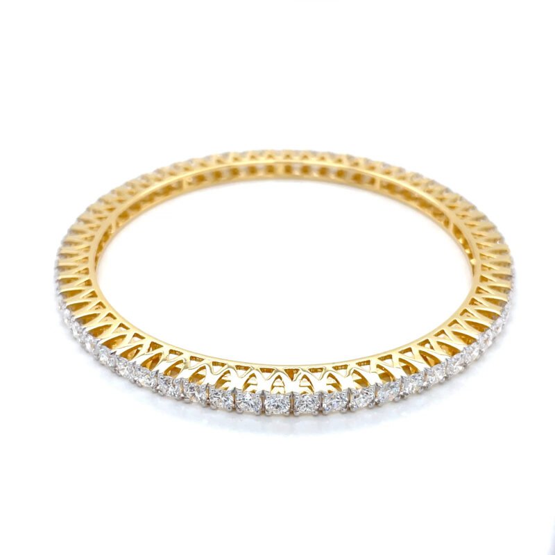 Embrace timeless elegance with this traditional Indian single row diamond bangle, handcrafted in 14K gold and set with sparkling 0.10ct VS clarity diamonds. A perfect blend of heritage and luxury, this piece is ideal for both everyday wear and special occasions.