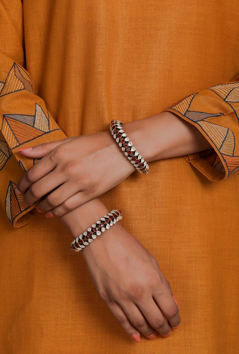 This handcrafted kada bangle pair fuses tradition with artistry—featuring lab-created diamond Polki, semi-precious emerald stones, and intricate red & green enamel work, all set in gold-plated 925 sterling silver.