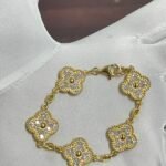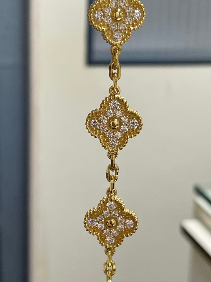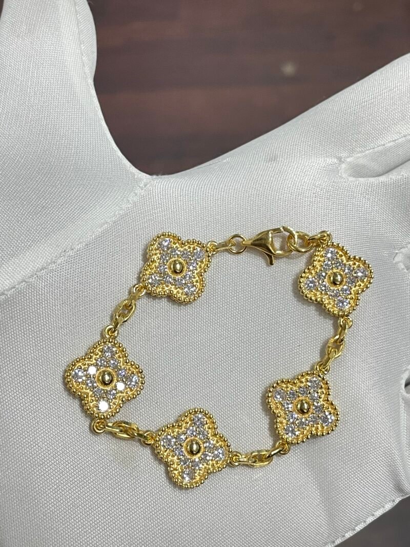 Inspired by the iconic Van Cleef Alhambra design, this luxurious bracelet is meticulously handcrafted in solid 18K yellow gold, featuring 15mm motifs fully encrusted with EF–VVS grade lab-grown diamonds for unmatched brilliance and fire.